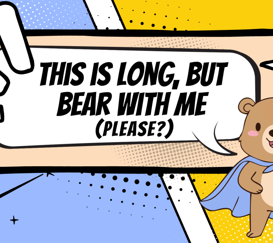 Image reads: This is long, but bear with me (please?). The text appears in a speech bubble, with the tail indicating that the speaker is a small comic bear dressed in a cape like a superhero, positioned off to the right. The background features images associated with comic paneling. Continue reading Mission Accomplished: Building an Accessible, No-Cost Comics Course! MASSIVE UPDATE