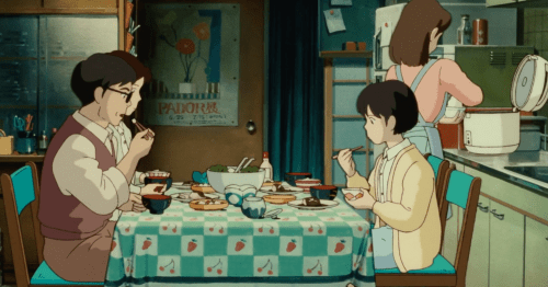 I didn’t notice the family dynamics in the movie during my previous watches, but they really stood out to me this time. Shizuku’s family brings an interesting dynamic to Whisper of the Heart that isn’t really seen in other Studio Ghibli movies. The family lives in a crowded apartment, and the parents are a little distant because they’re busy with work. The family has a set of chores they attempt to distribute evenly, but the older sister notices that Shizuku’s not pulling her weight: