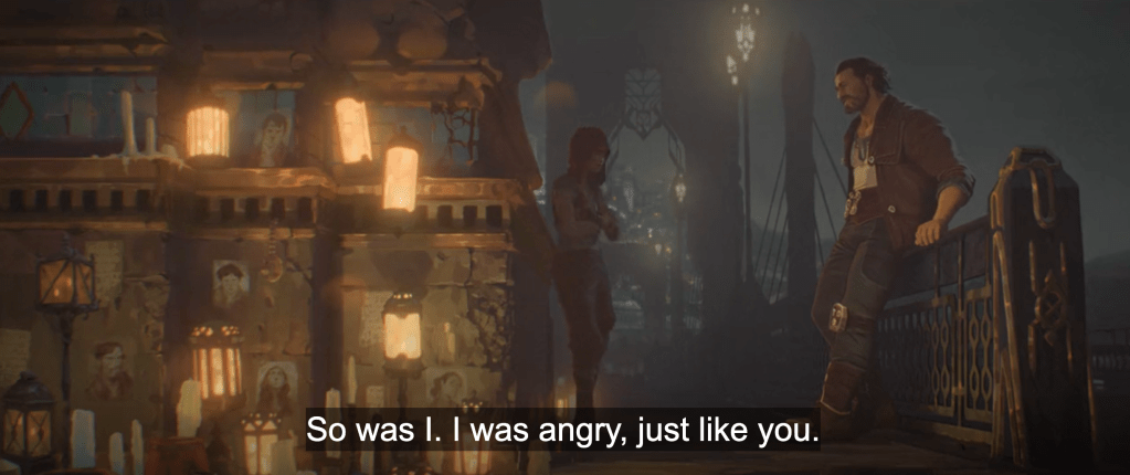 Vander lays out his regrets to Vi, and it’s important that he recognizes and validates Vi’s anger and feeling of helplessness. He understands and sees the desire she has to change things–the same that he had–but asks, “Who are you willing to lose?” (Episode 2, Arcane). This goes back to Episode 1 as he’s advising her leader-to-leader on the casualties of her crusade if she continues this path, one that could put the family (specifically Powder) in danger.