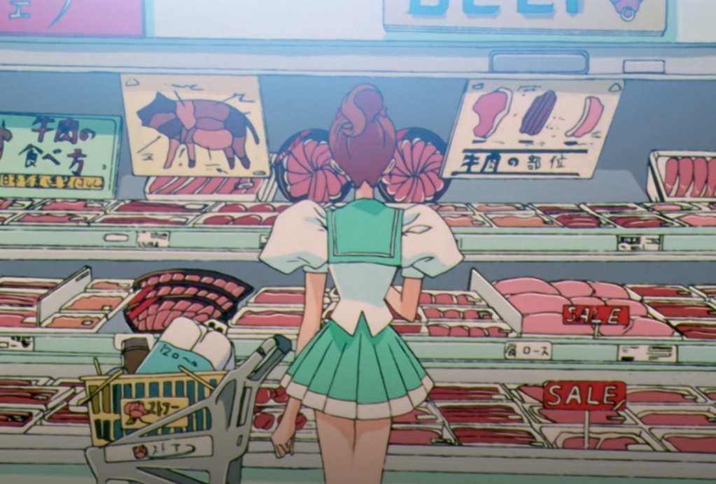 The setting for this realization is at a supermarket. As the Absolute Destiny podcast points out in their great episode on “Wakaba Flourishing,” Wakaba’s grip on the packaged meat she’s holding parallels the tension in that conversation with Saionji. As she presses her fingers against the plastic wrapping, almost but not quite breaking it, the tension in the other scene and their overall relationship is increased.