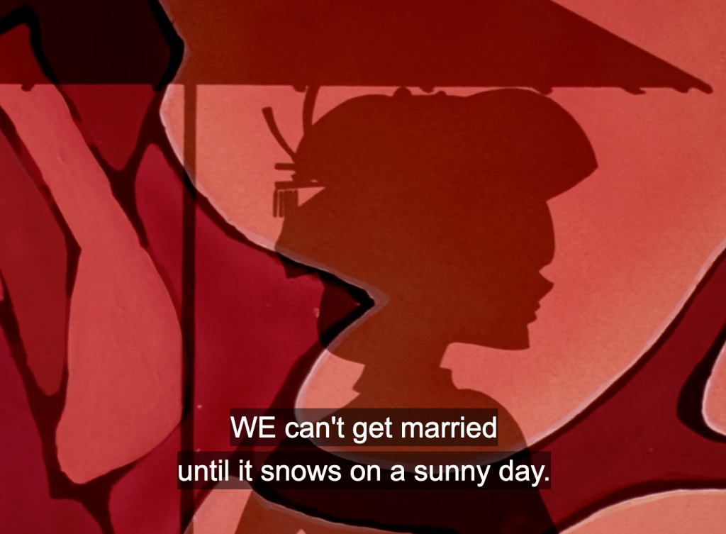 For this episode’s skit featuring the shadow girls, it’s a very short one! My reading of it was that the shadow girls are mocking the ridiculous games that go into dating and relationships in general, but specifically pointing out how girls often get the short end when in relationships with men. It’s also curious that the shadow girls divide themselves into a fox girl and a rabbit girl in a way reminiscent of how girls are either sanctified or demonized. I think this reading has more validity considering the depiction of the rabbit girl in a traditional hairstyle as if she’s presenting herself as more demure before switching to a Playboy bunny outfit. In reality, the rabbit girl is what she is either way but it’s a question of presenting oneself to be appealing enough for marriage.