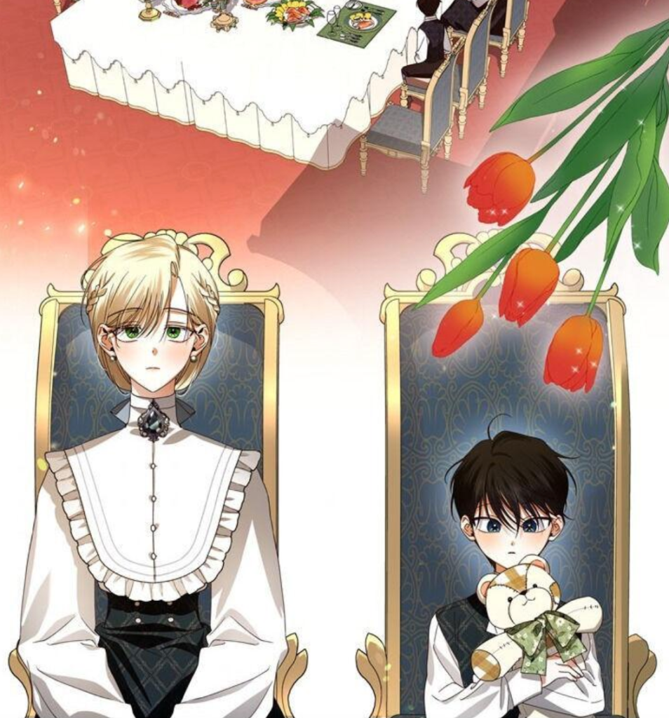 This seems to be a semi-regular occurrence for twins in manhwa and manga, and it always seems very cool to me how the artists can turn this romance trope into a statement about the relationship of the characters and their different personalities. Arhen, the brother in the images above, has a more relaxed image to him than his sister. In another, perhaps better, example, the twins from Dear Nemesis also dress in matching outfits with some consistency; however, the two have very different approaches to the style. The sister, Calmia, tends to wear tighter cuffed sleeves, with higher and tighter collars while her brother has a more airy, flowy collar (often cuffs too). She’s supposed to appear, in my understanding, as having a more controlled appearance which lends to her character’s personality and mindset within the story through the imagery.