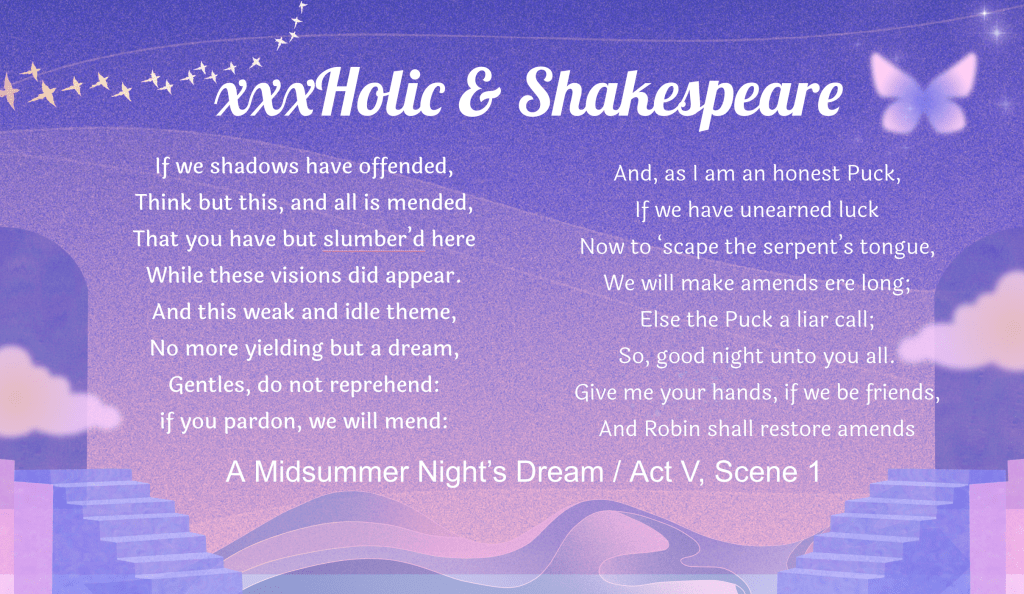 Essentially, where xxxHolic and Shakespeare overlap in this movie is in the themes and partial imagery. We see it in with the use of Dreams/the Moon, the appearance vs. reality, and with the differing states of order and disorder. They are not a one-for-one with each other, as the movie is not a retelling of the play. However, they are not disconnected either, and share more than just a name!