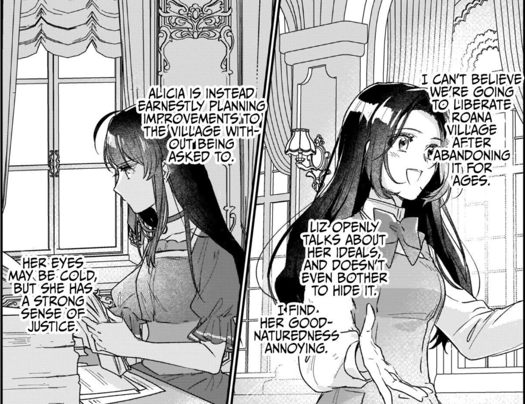 This reflection brought to mind another cherished scene from the manga for I’ll Become a Villainess That Will Go Down in History, which is currently airing its first animated season. While I’m unsure if the scene I’m about to describe will be animated, it certainly deserves recognition for its impact. (I’m referring specifically to the concluding chapter of Volume 3, where the supporting cast evaluates the main character, Alicia, in comparison to Liz, the “rival” within the story. Rather than chapter, it might be better to call this a chapter addition or omake, but I’m not 100% certain so we’ll just call it Chapter 15.5, okay?)