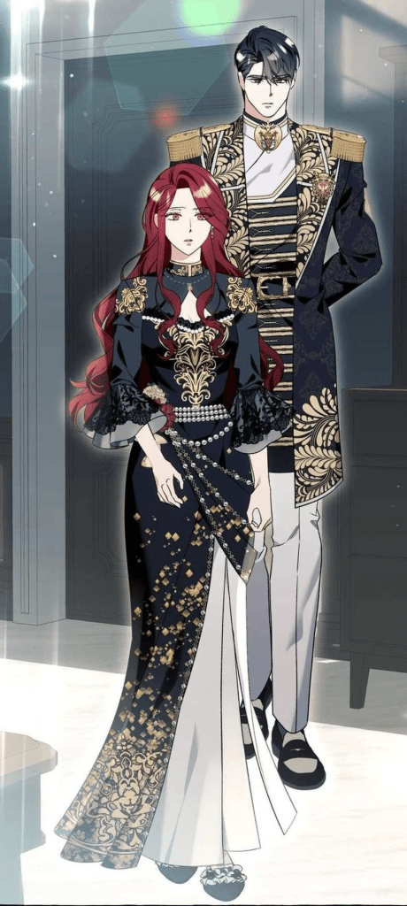As the story progresses, we see Edith and Killian continue to be on very different pages emotionally. This is reflected in their clothing. For instance, in Chapter 10, Edith wears a vibrant yellow, gold, and red dress, while Killian opts for black and gold with red accents. The shared red details subtly suggest an emotional link beginning despite their strained relationship.
