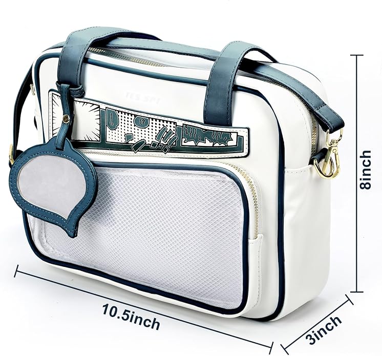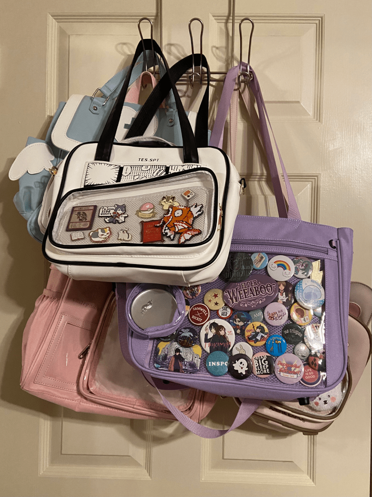 The bag above, the one I carry regularly, has several different names and different places to buy it online. On Amazon I have seen it called “Ita Bag Crossbody Cute Small Pin Purse Kawaii Anime Messenger Bag for Women” from Armor Gift Shop, I’ve seen it from online stores like moemoekyun.com, where it is called “Japanese High School Cartoon Style Ita Bag” and there are a few other variations across different stores.