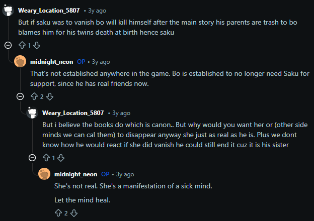 As someone with DID, seeing people essentially say that you are indulging a delusion or that you need to let Bo’s “sick mind” heal, I feel my blood simmer to a boil. Not only is this ableist in the sense that they are taking away Bo’s agency over his own system as they believe they know what’s best for him. It also completely disregards Saku’s feelings and encourages her decision to—as the game implies—die. They don’t see Saku as an integral part of Saku-bo, they see her as an error, an illness, a part that doesn’t deserve to live.